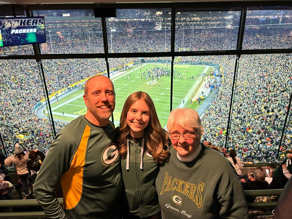 Just last week, Alyssa and I treated Grandma Pam to the Packers/Bears game from the indoor club seats at Lambeau. It was an exciting game, with lots of long passes for Packer touchdowns, and an interception to seal the Packer win at the end.